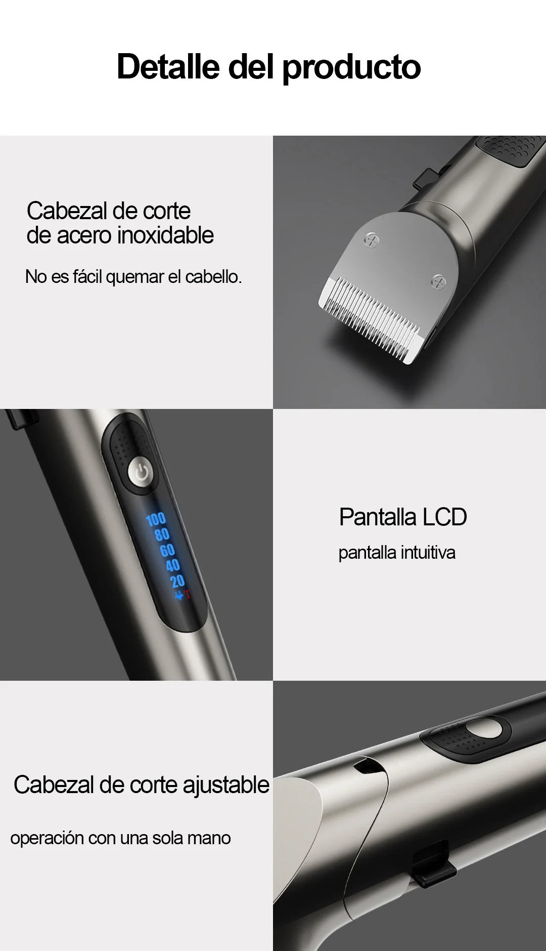 ? Cabezal de corte de acero inoxidable que no quema el cabello fácilmente ? pantalla LCD intuitiva ? cabezal de corte ajustable con una sola mano