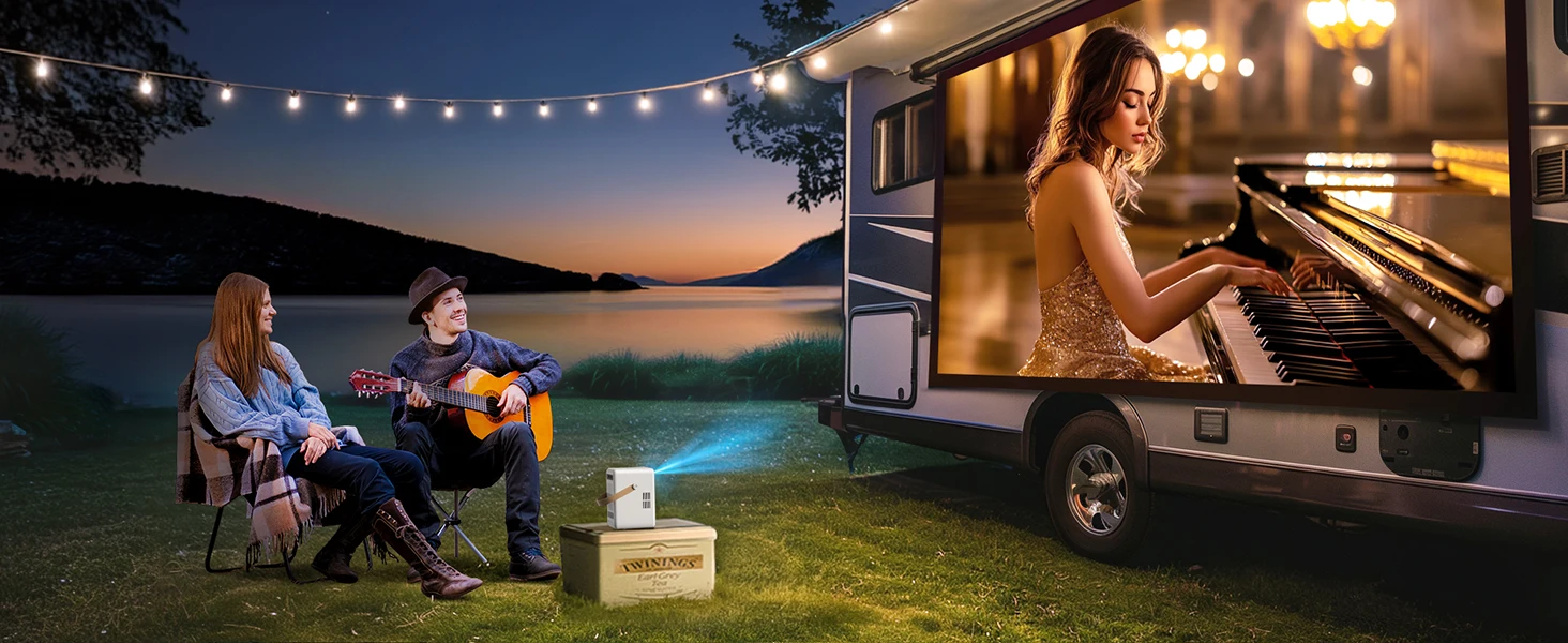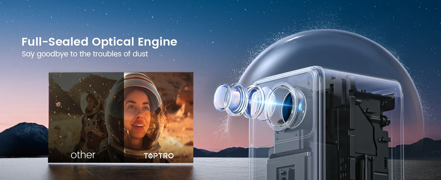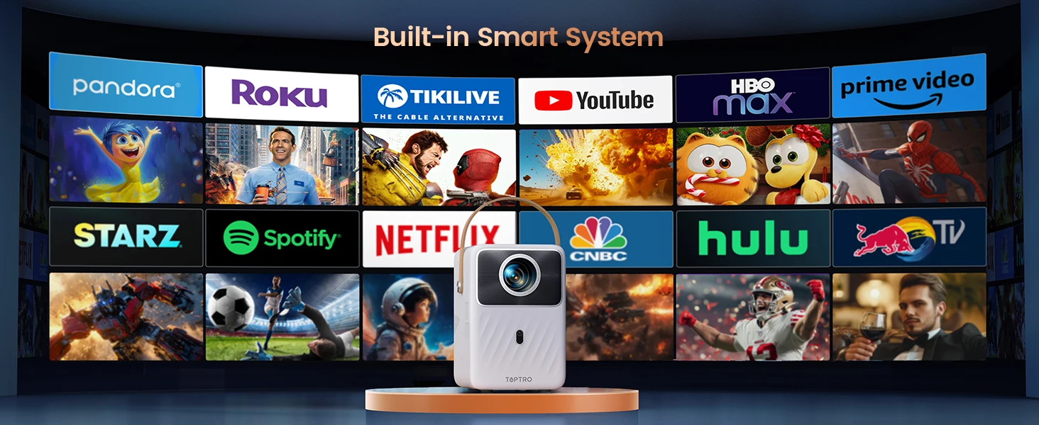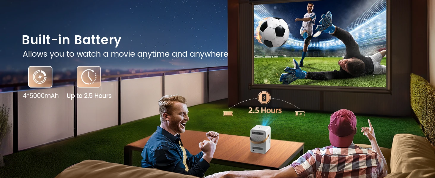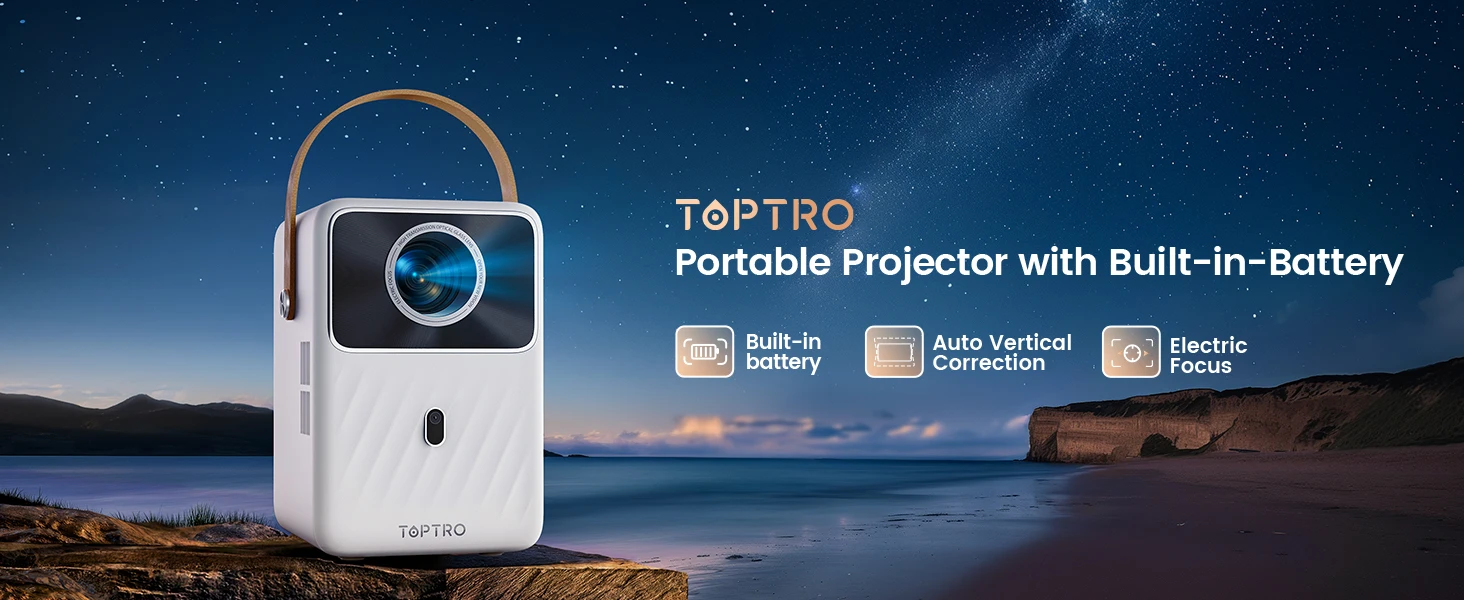 ?Android TV Video Projector Rechargeable Battery, 2.5H Battery Life?This TOPTRO portable outdoor video projector has built-in Android TV, so you can easily access a large number of applications from Netflix, Prime Video, YouTube, etc. Equipped with a large-capacity battery with ultra-long standby time, it can provide up to 2.5H of uninterrupted video playback, which is very suitable for camping, beach parties and outdoor entertainment.