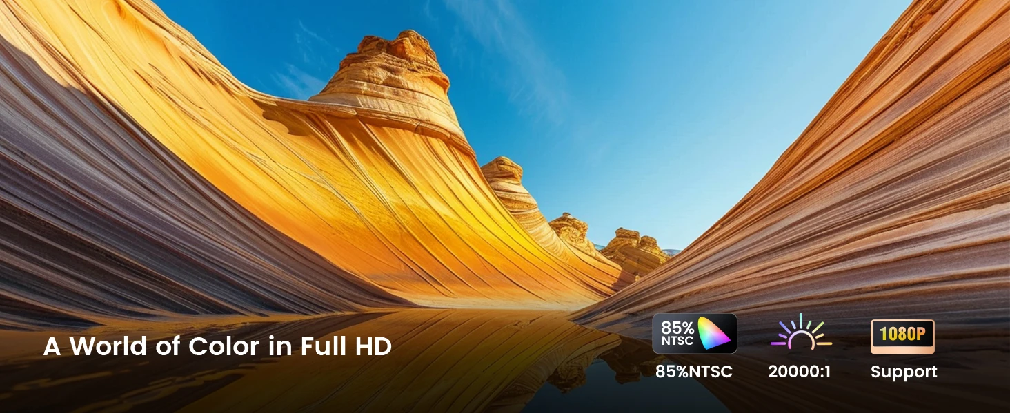 ?Portable 1080P FHD Projector, Dustproof Sealed, 50% Zoom?This mini projector has 400 Ansi lumens, 23000:1 contrast, 1080P FHD definition and the latest HDR processing technology provides colorful and more detailed images. The Android TV projector lens uses IP5X dustproof optical technology, eliminating dust problems and extending the life of the projector. The 50% zoom allows you to adjust the image to the appropriate size you want