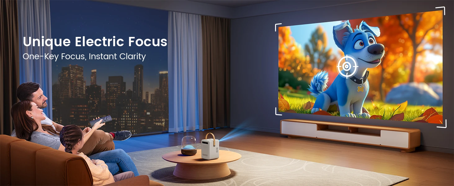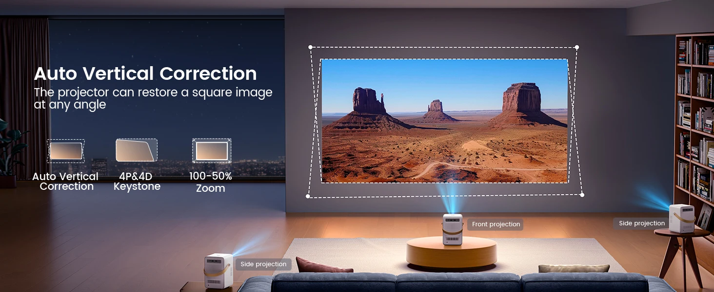 ?Electric Focus & Auto Keystone 4P/4D?The portable video projector has a new electric focus function. One-touch operation can easily get clear videos and images. The portable projector also features ±30°automatic vertical correction and 4P/4D keystone correction, which can automatically and manually adjust the image to a rectangular shape, making it more flexible for front/side/ceiling projection.