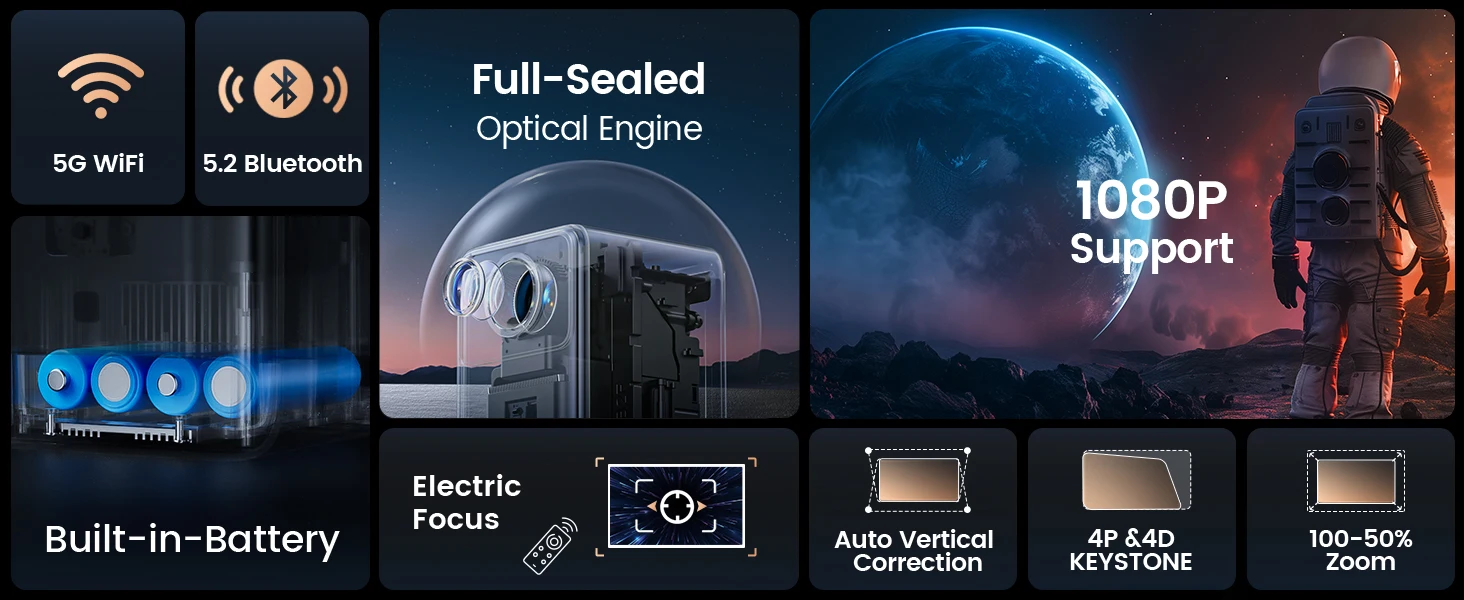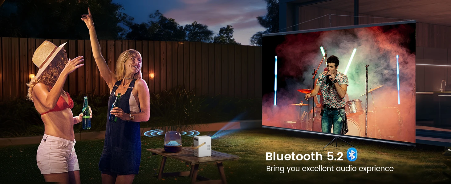 ?Ultra-fast 5G WiFi & Bluetooth 5.2 Portable Projector?The wifi bluetooth projector is equipped with the latest ultra-fast 5G WiFi technology and supports wireless screen mirroring of iOS/Android/iPad/Windows devices, providing a smoother and faster video/game experience. The projector integrates a Bluetooth 5.2 chip, which can wirelessly connect to Bluetooth headphones/speakers/Airpods and enjoy immersive 3D cinema surround sound at any time.