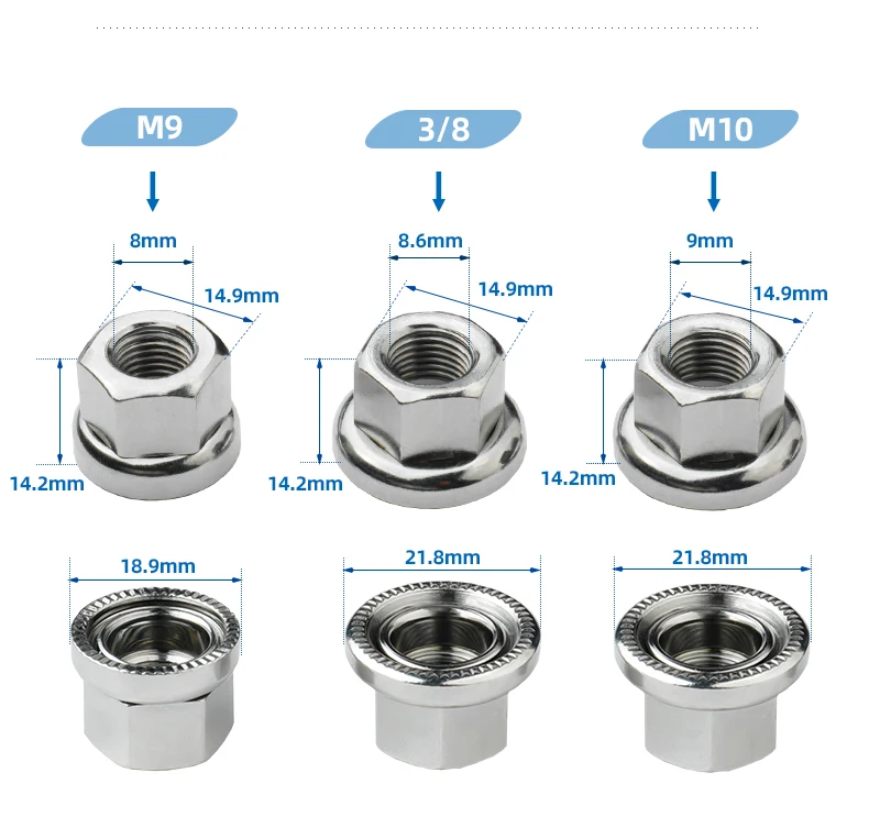 2. Para roscar métricamente, normalmente el buje delantero toma M9 y el buje trasero M10.Pero hay algunos tipos de bicicletas que llevan M10 tanto en el buje delantero como en el trasero.